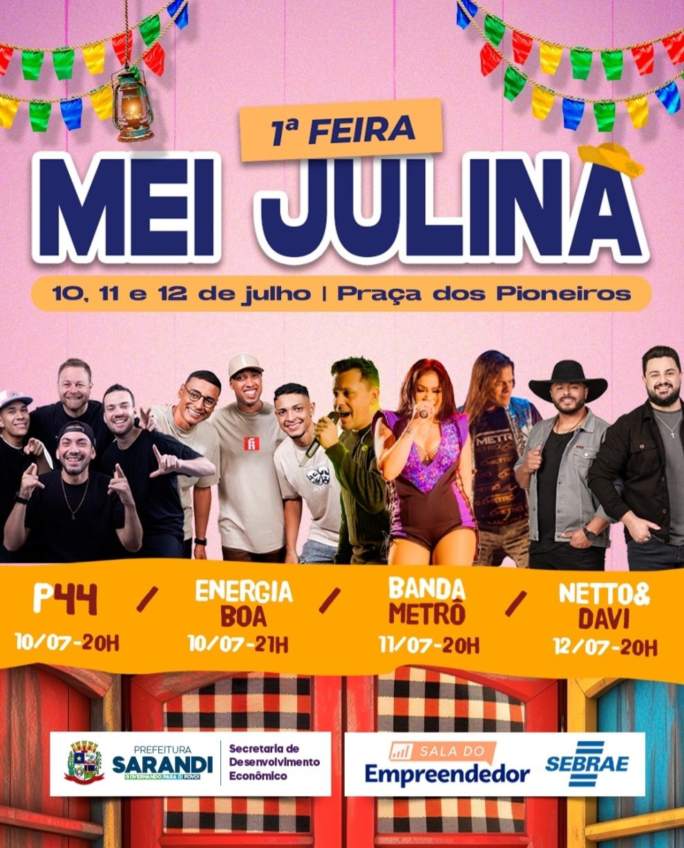 Nos dias 10, 11 e 12 de julho, a Praça dos Pioneiros, em Sarandi, será palco da 1ª Feira MEI-JULINA, uma realização da Prefeitura Municipal por meio da Secretaria de Desenvolvimento Econômico. O evento promete três dias de festa, cultura, empreendedorismo e muita música para toda a família. A programação está recheada de atrações culturais, apresentações musicais, gastronomia típica, artesanato e exposição de microempreendedores locais. Uma oportunidade para valorizar a cultura regional e incentivar o comércio local.
