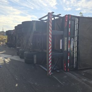 Carreta carregada com farinha de trigo tomba no entroncamento das rodovias PR-317 e PR-323 em Maringá