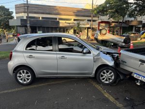 Um carro capotou após um acidente registrado na Avenida Franklin Delano, no Conjunto Requião, Zona Norte de Maringá, na tarde da última segunda-feira, 16. A colisão envolveu um Fiat Palio, um Nissan March e uma picape Ford Courier, que estava estacionada. Segundo informações levantadas no local, um dos veículos que estava parado teria saído repentinamente, invadindo a via e provocando a batida.