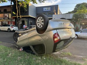Um carro capotou após um acidente registrado na Avenida Franklin Delano, no Conjunto Requião, Zona Norte de Maringá, na tarde da última segunda-feira, 16. A colisão envolveu um Fiat Palio, um Nissan March e uma picape Ford Courier, que estava estacionada. Segundo informações levantadas no local, um dos veículos que estava parado teria saído repentinamente, invadindo a via e provocando a batida.