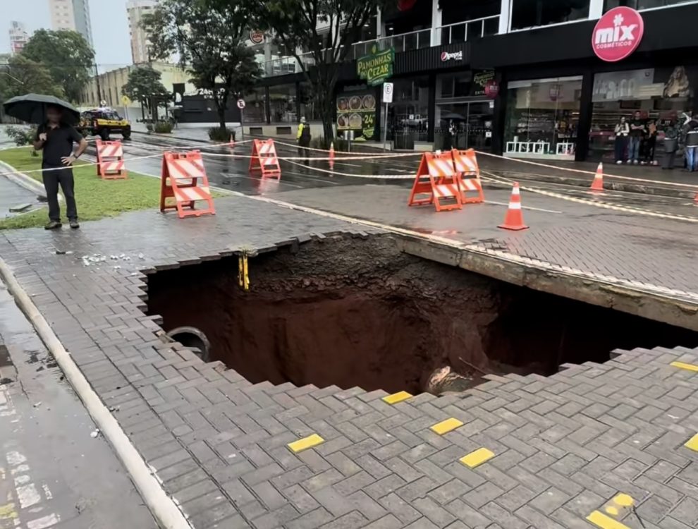Uma cratera se abriu na manhã desta segunda-feira (13) na Avenida São Paulo, ao lado do shopping Avenida Center, na área central de Maringá. De acordo com o secretário de Infraestrutura do município, Wagner Mússio, o problema foi causado pelo rompimento de galerias de água pluvial. Ele explicou que, além dessas galerias, passa pelo trecho uma linha que leva a água desde o Parque do Ingá até o antigo viaduto, onde ocorre a distribuição — o que torna a situação ainda mais grave. Segundo o secretário, o buraco aumentou de forma muito rápida e há risco de ampliação da cratera.