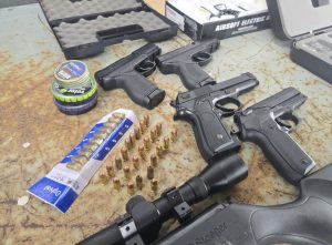 Diante da informação, a PM realizou diligências na residência do segundo envolvido. No local, foram encontradas quatro pistolas de airsoft, uma espingarda de pressão, dois carregadores de pistola de calibre letal guardados em uma maleta da marca Taurus, além de munições calibre 9mm. Todo o material foi apreendido e os dois homens encaminhados à Delegacia de Polícia Civil para serem tomadas as medidas cabíveis.