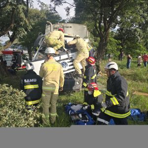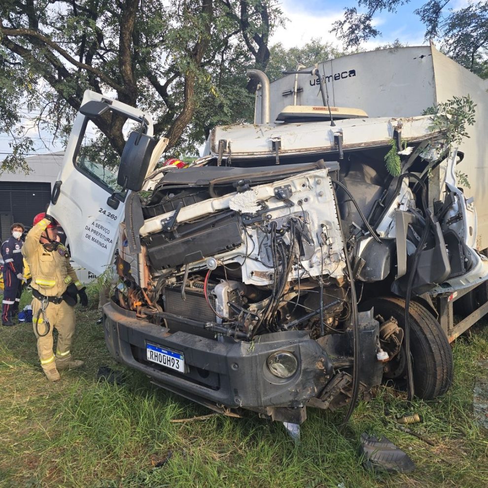 Um grave acidente de trânsito mobilizou equipes do Corpo de Bombeiros e socorristas do SAMU no final da tarde desta sexta-feira (17), no Anel Viário Prefeito Sinclair Sambatti, no Contorno Sul de Maringá. De acordo com as informações, um caminhão de uma empresa terceirizada que presta serviços para a Prefeitura, especialmente na coleta seletiva, seguia pela via quando o motorista, identificado como Oseias Rodrigues da Silva, de 47 anos, perdeu o controle da direção. O veículo subiu no canteiro central que divide as pistas e colidiu violentamente contra uma árvore. Com a força do impacto, a cabine do caminhão ficou completamente destruída, deixando o condutor preso entre as ferragens. As equipes de resgate precisaram realizar um trabalho delicado para retirar a vítima do interior do veículo.