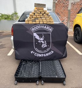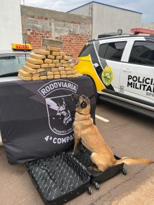 A Polícia Militar do Paraná, por meio do Batalhão de Polícia Rodoviária (BPRv), apreendeu 31 quilos de maconha durante uma abordagem na rodovia PR-323, em Perobal, na manhã desta quinta-feira (2). A ação ocorreu por volta das 7h, quando a equipe da 4ª Companhia, com apoio dos cães de faro Zeus e Thor, realizou a fiscalização de um táxi proveniente do Paraguai. Durante a vistoria, os animais indicaram a presença de drogas em uma mala localizada no porta-malas do veículo.